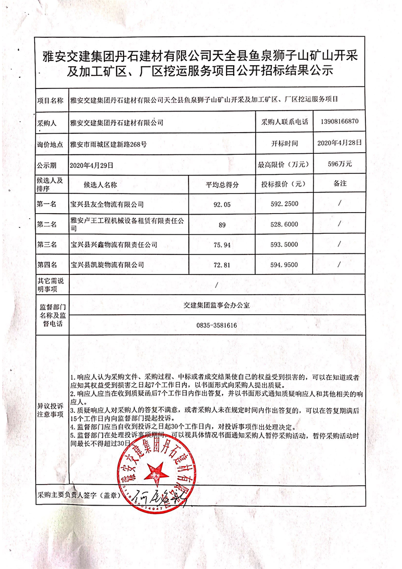 雅安交建集團丹石建材有限公司天全縣魚泉獅子山礦山開采及加工礦區(qū)、廠區(qū)挖運服務(wù)項目公開招標結(jié)果公示