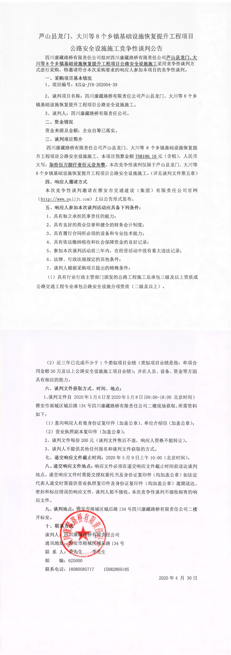 四川康藏路橋有限責任公司蘆山縣龍門、大川等8個鄉(xiāng)鎮(zhèn)基礎設施恢復提升工程項目公路安全設施施工競爭性談判公告