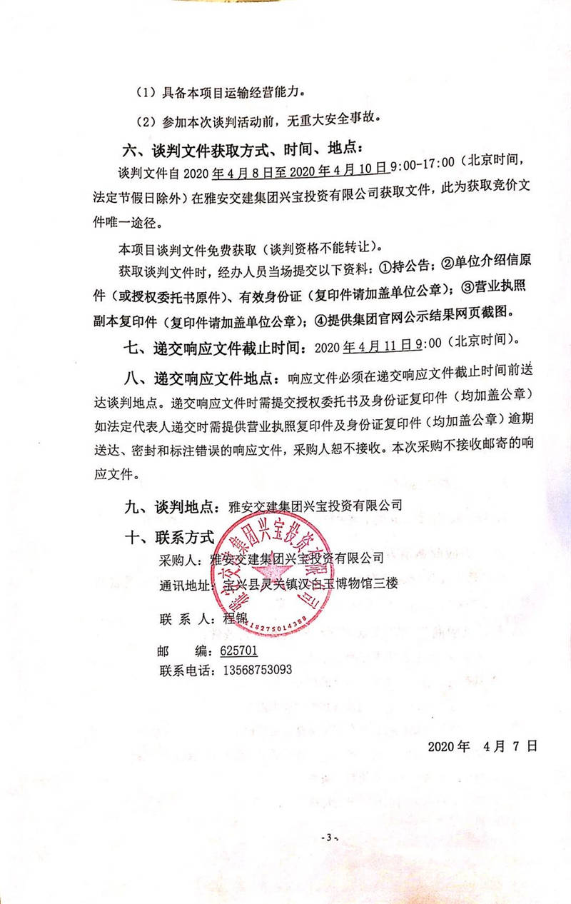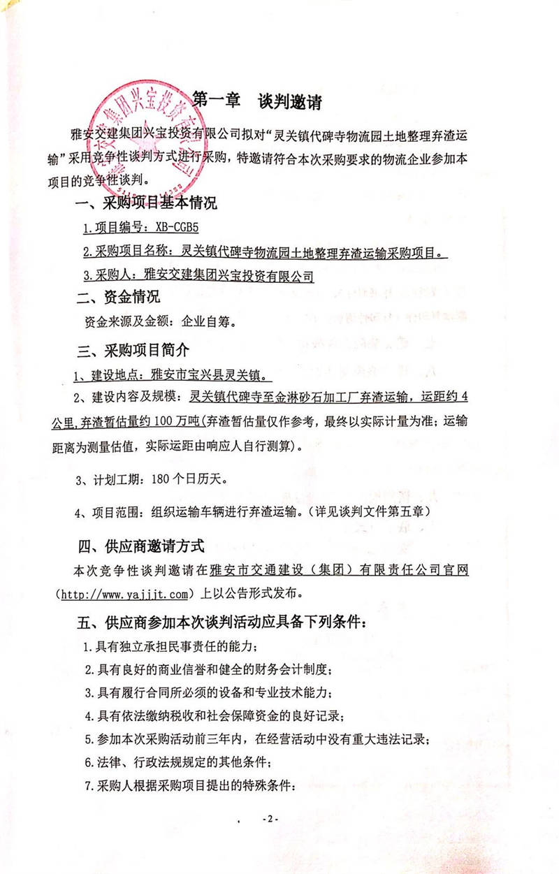 雅安交建集團(tuán)興寶投資有限公司靈關(guān)鎮(zhèn)代碑寺物流園土地整理?xiàng)壴\(yùn)輸采購項(xiàng)目競爭性談判公告