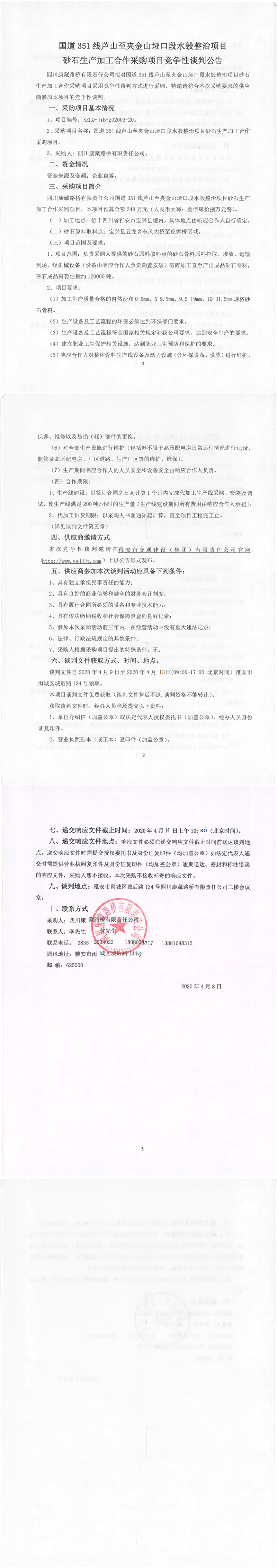 四川康藏路橋有限責(zé)任公司國道351線蘆山至夾金山埡口段水毀整治項(xiàng)目砂石生產(chǎn)加工合作采購項(xiàng)目競(jìng)爭(zhēng)性談判公告
