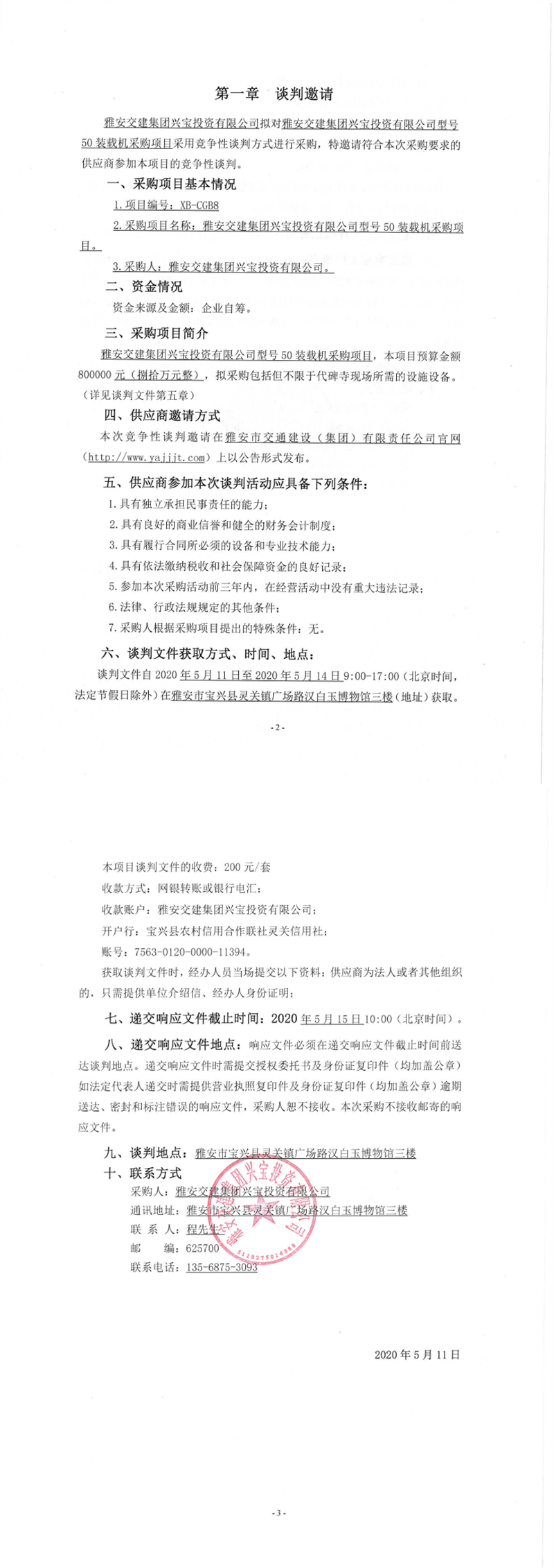 雅安交建集團(tuán)興寶投資有限公司型號(hào)50裝載機(jī)采購項(xiàng)目競(jìng)爭性談判公告