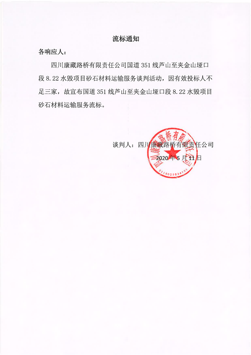 四川康藏路橋有限責(zé)任公司國道351線蘆山至夾金山埡口段8.22水毀項(xiàng)目砂石材料運(yùn)輸服務(wù)流標(biāo)通知
