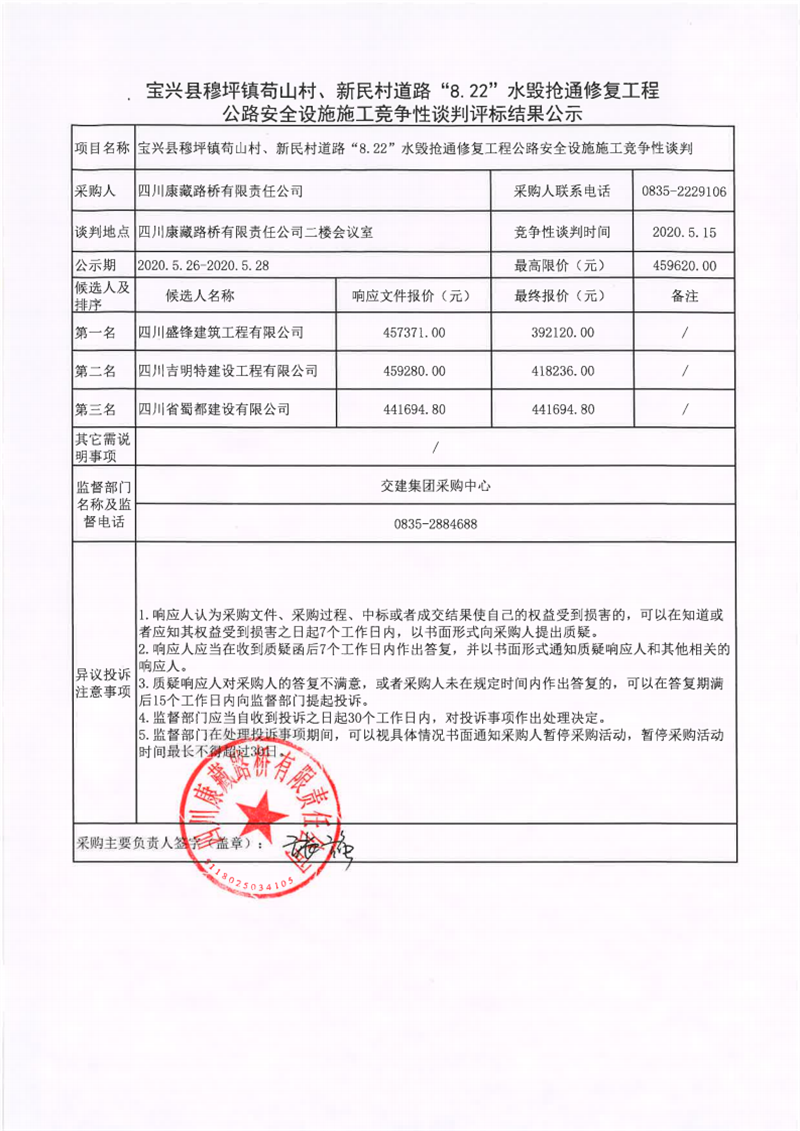 四川康藏路橋有限責(zé)任公司寶興縣穆坪鎮(zhèn)茍山村、新民村道路“8.22”水毀搶通修復(fù)工程公路安全設(shè)施施工競爭性談判評標(biāo)結(jié)果公示