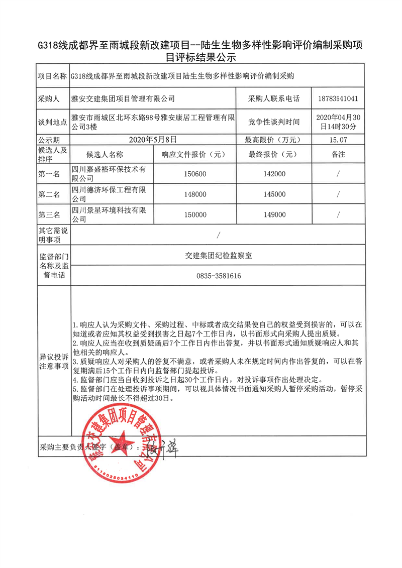 雅安交建集團(tuán)項(xiàng)目管理有限公司G318線成都界至雨城段新改建項(xiàng)目陸生生物多樣性影響評(píng)價(jià)編制采購(gòu)項(xiàng)目評(píng)標(biāo)結(jié)果公示
