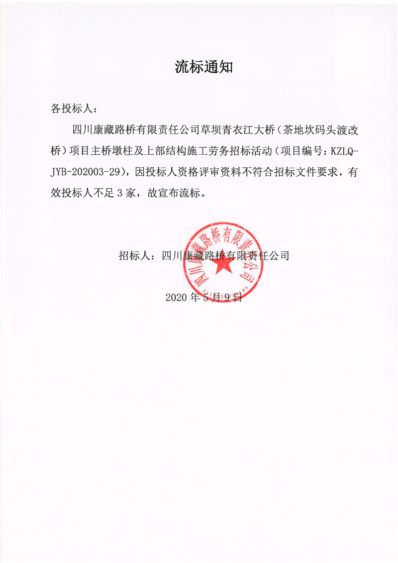 四川康藏路橋有限責任公司草壩青衣江大橋(茶地坎碼頭渡改橋)項目主橋墩柱及上部結(jié)構(gòu)施工勞務(wù)流標通知