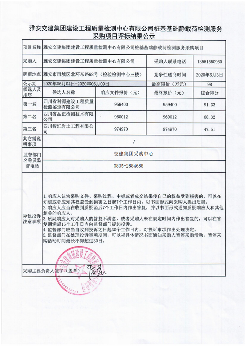 雅安交建集團(tuán)建設(shè)工程質(zhì)量檢測中心有限公司樁基基礎(chǔ)靜載荷檢測服務(wù)采購項目評標(biāo)結(jié)果公示