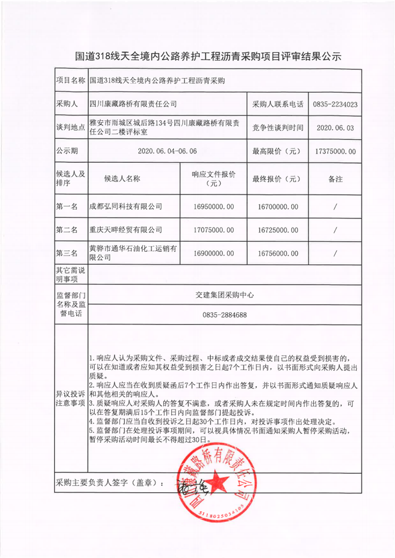 四川康藏路橋有限責任公司國道318線天全境內(nèi)公路養(yǎng)護工程瀝青采購項目評審結(jié)果公示