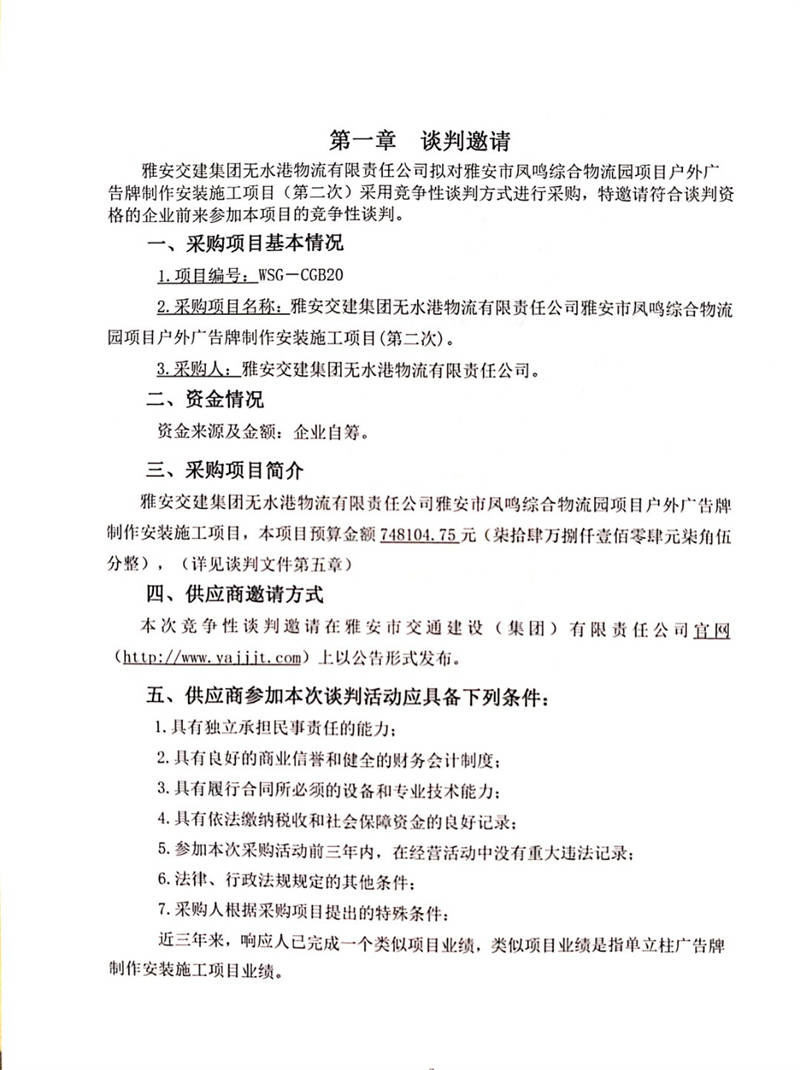 雅安交建集團無水港物流有限責(zé)任公司雅安市鳳鳴綜合物流園項目戶外廣告牌制作安裝施工項目(第二次)競爭性談判公告