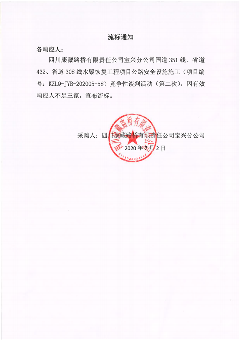 四川康藏路橋有限責(zé)任公司寶興分公司國道351線、省道432線、省道308線水毀恢復(fù)項目公路安全設(shè)施施工競爭性談判(第二次)流標通知