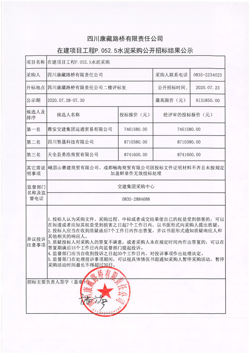 四川康藏路橋有限責(zé)任公司在建項(xiàng)目工程P.052.5水泥采購(gòu)公開招標(biāo)結(jié)果公示