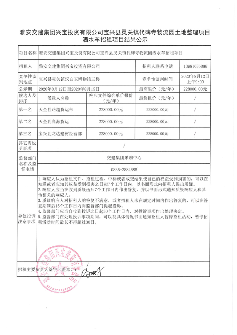 雅安交建集團(tuán)興寶投資有限公司寶興縣靈關(guān)鎮(zhèn)代碑寺物流園灑水車招租項(xiàng)目結(jié)果公示