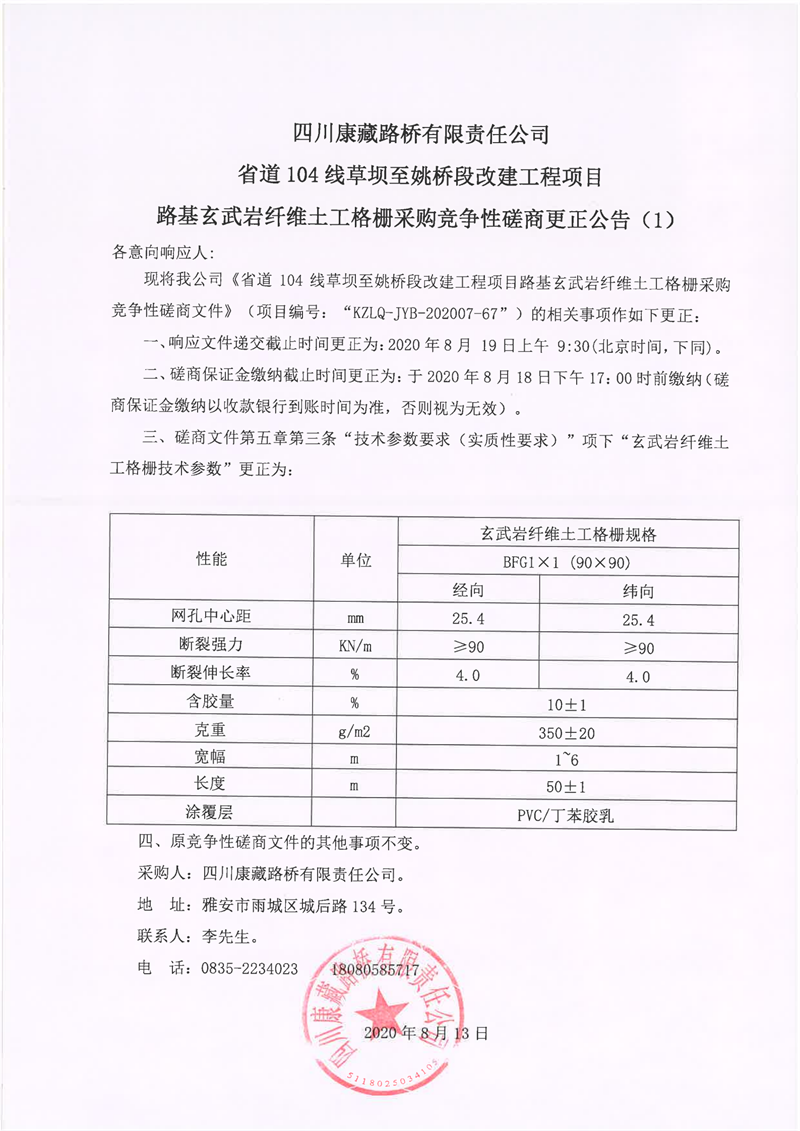 四川康藏路橋有限責(zé)任公司省道104線草壩至姚橋段改建工程項目路基玄武巖纖維土工格柵采購競爭性磋商更正公告(1)