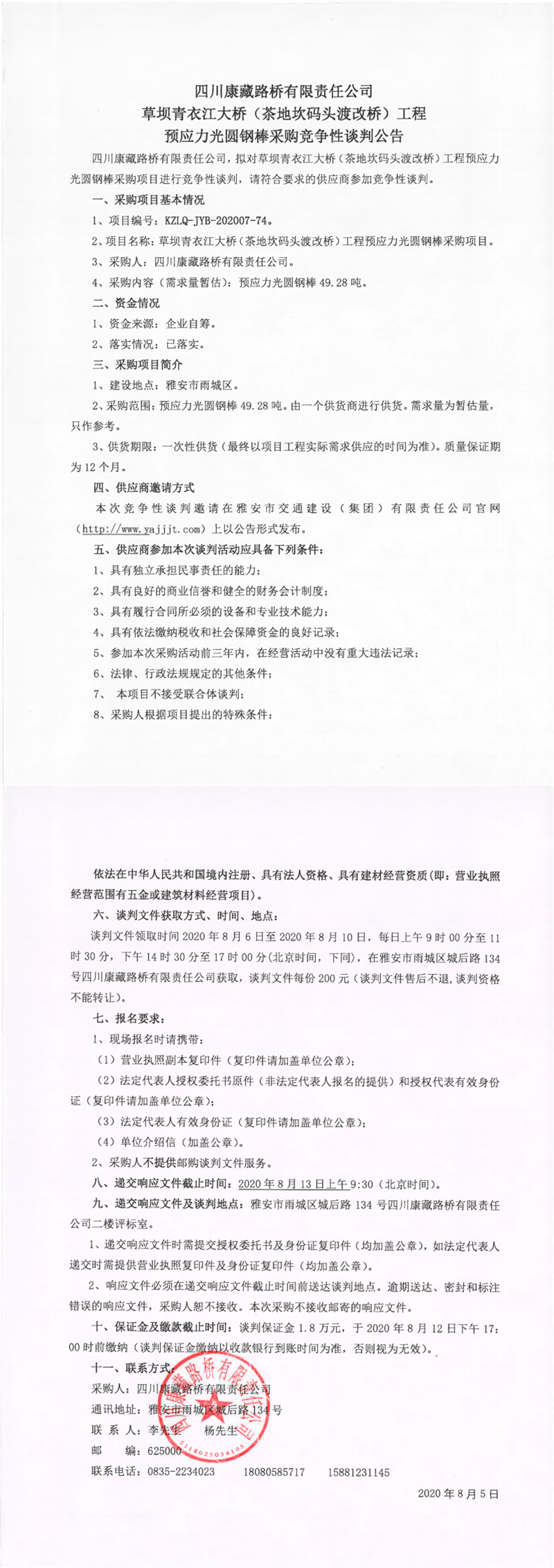 四川康藏路橋有限責(zé)任公司草壩青衣江大橋(茶地坎碼頭渡改橋)工程預(yù)應(yīng)力光圓鋼棒采購競(jìng)爭(zhēng)性談判公告