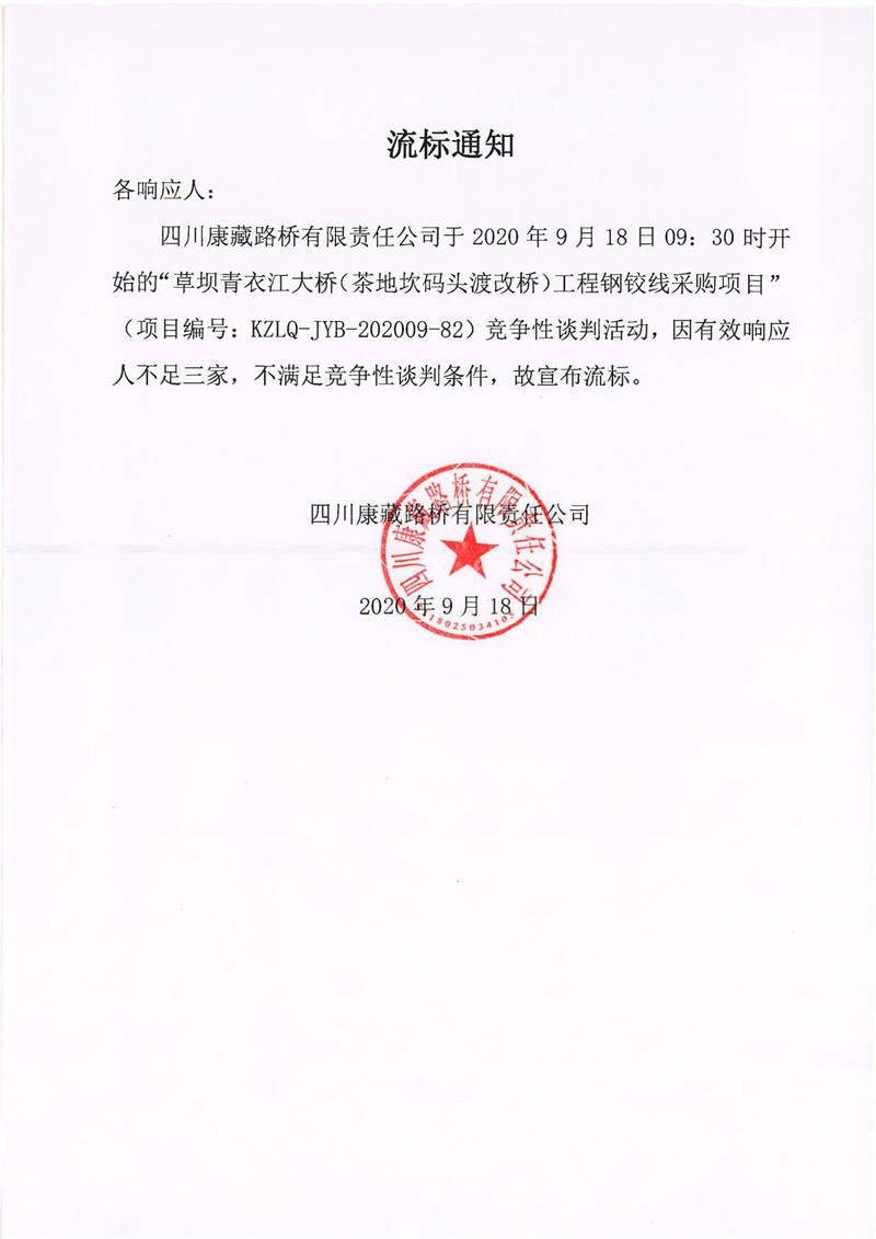四川康藏路橋有限責(zé)任公司草壩青衣江大橋(茶地坎碼頭渡改橋)工程鋼鉸線采購項(xiàng)目流標(biāo)通知