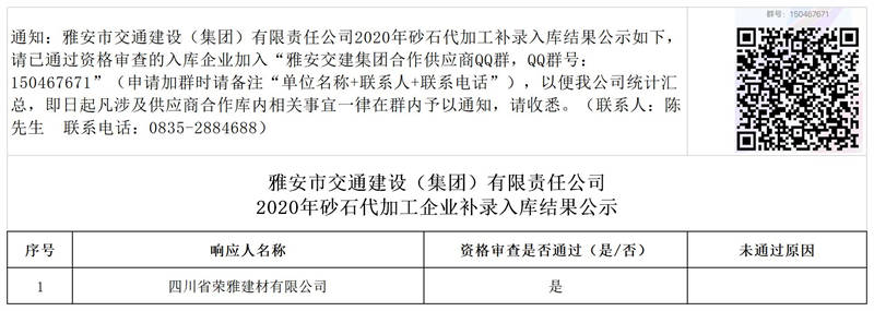 雅安市交通建設(集團)有限責任公司2020年砂石代加工企業(yè)補錄入庫結果公示