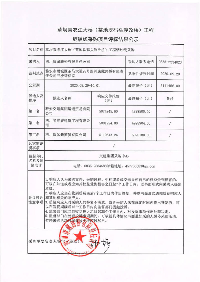四川康藏路橋有限責(zé)任公司草壩青衣江大橋(茶地坎碼頭渡改橋)工程鋼鉸線采購項(xiàng)目評(píng)標(biāo)結(jié)果公示