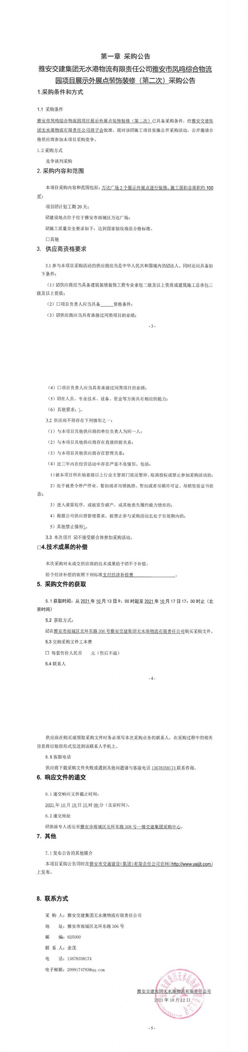 雅安交建集團(tuán)無水港物流有限責(zé)任公司雅安市鳳鳴綜合物流園項(xiàng)目展示外展點(diǎn)裝飾裝修(第二次)采購(gòu)公告