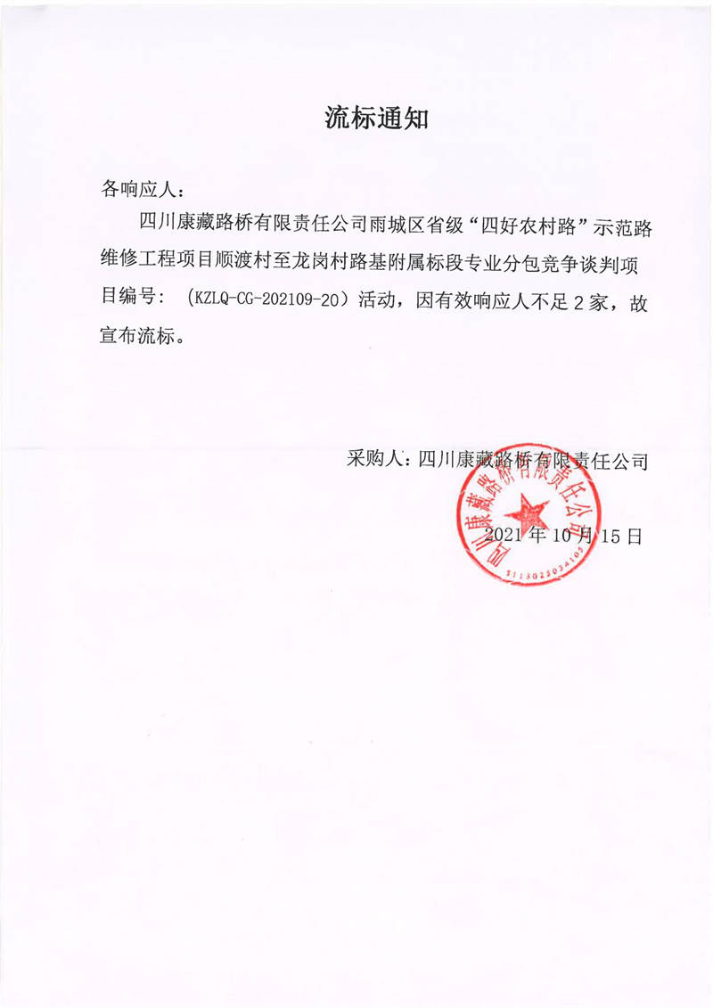 四川康藏路橋有限責(zé)任公司雨城區(qū)省級“四好農(nóng)村路”示范路維修工程項目順渡村至龍崗村路基附屬標(biāo)段專業(yè)分包流標(biāo)通知