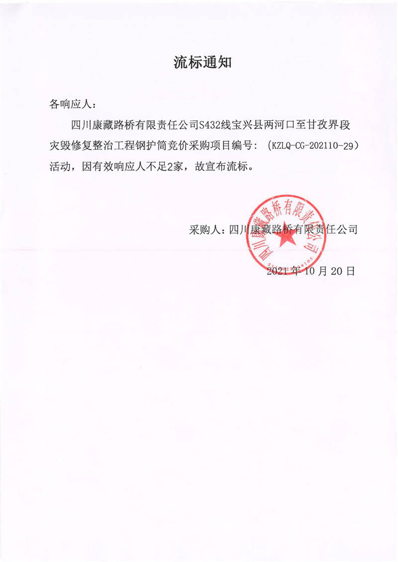 四川康藏路橋有限責(zé)任公司S432線寶興縣兩河口至甘孜界段災(zāi)毀修復(fù)整治工程鋼護(hù)筒競價采購流標(biāo)通知