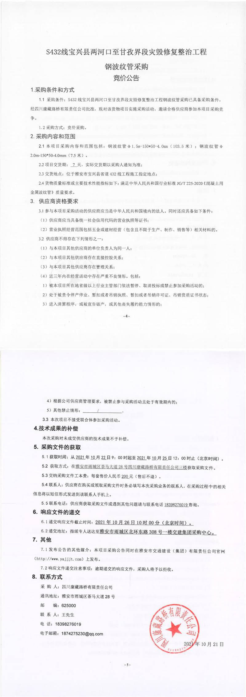 四川康藏路橋有限責任公司S432線寶興縣兩河口至甘孜界段災毀修復整治工程鋼波紋管采購競價公告