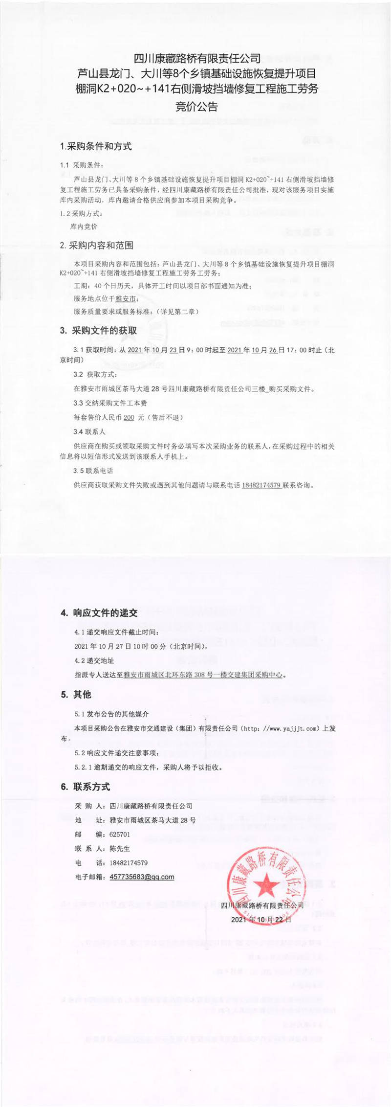 四川康藏路橋有限責(zé)任公司蘆山縣龍門、大川等8個(gè)鄉(xiāng)鎮(zhèn)基礎(chǔ)設(shè)施恢復(fù)提升項(xiàng)目棚洞K2+020~+141右側(cè)滑坡?lián)鯄π迯?fù)工程施工勞務(wù)采購競價(jià)公告