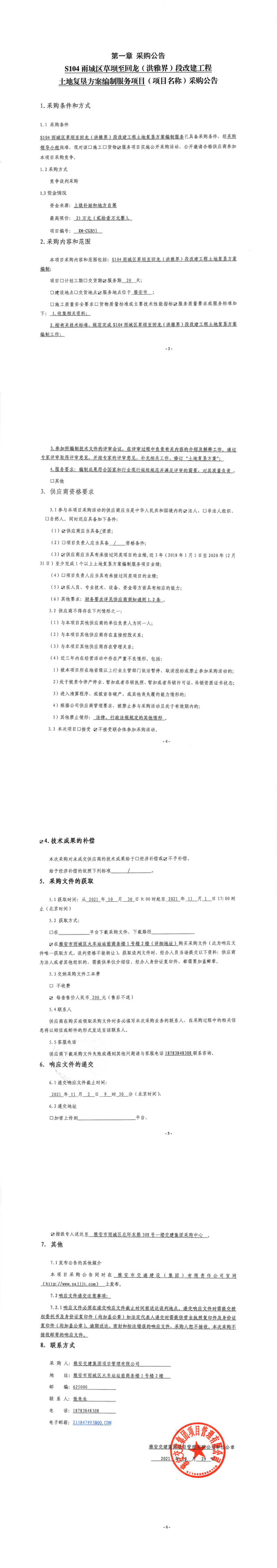 雅安交建集團項目管理有限公司S104雨城區(qū)草壩至回龍(洪雅界)段改建工程土地復(fù)墾方案編制服務(wù)項目采購公告