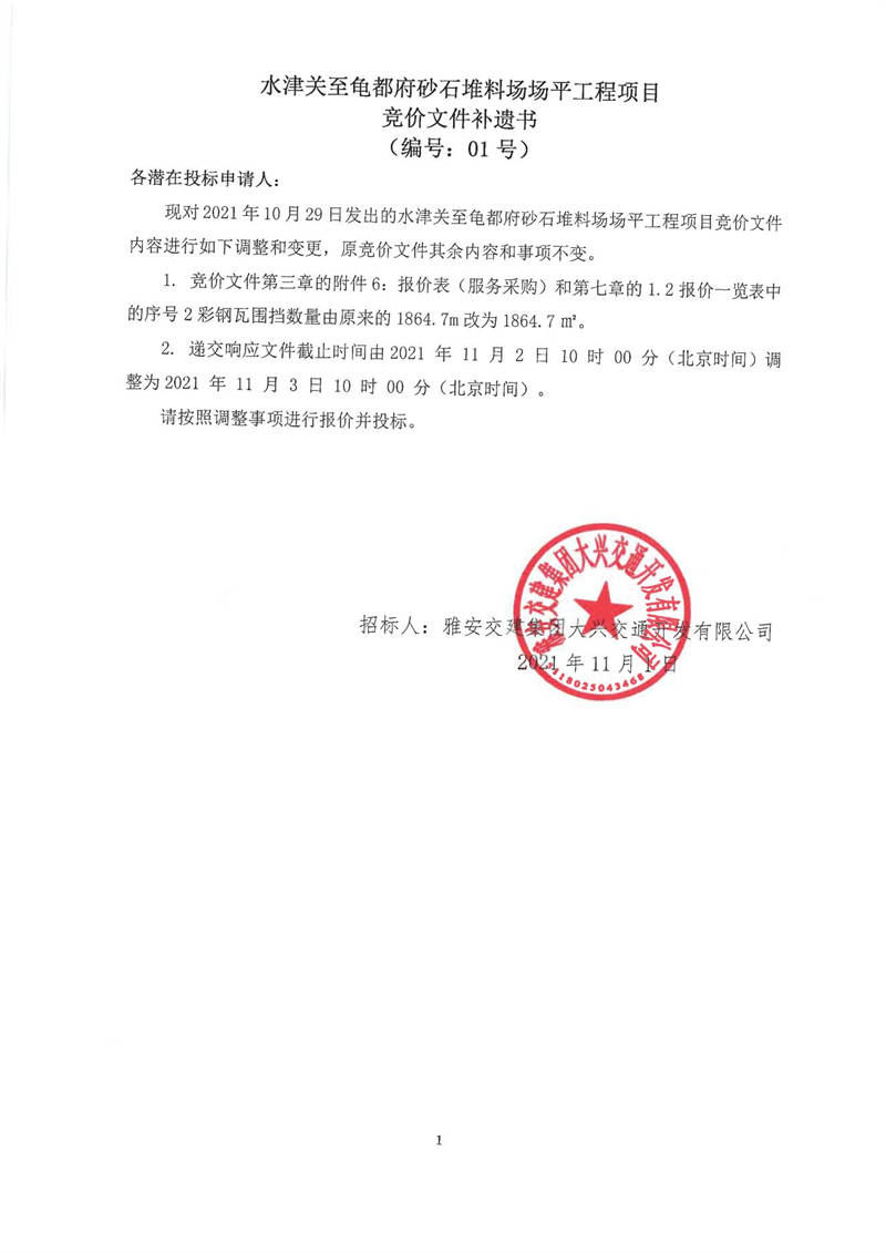 雅安交建集團大興交通開發(fā)有限公司水津關(guān)至龜都府砂石堆料場場平工程項目競價文件補遺書(編號:01號)