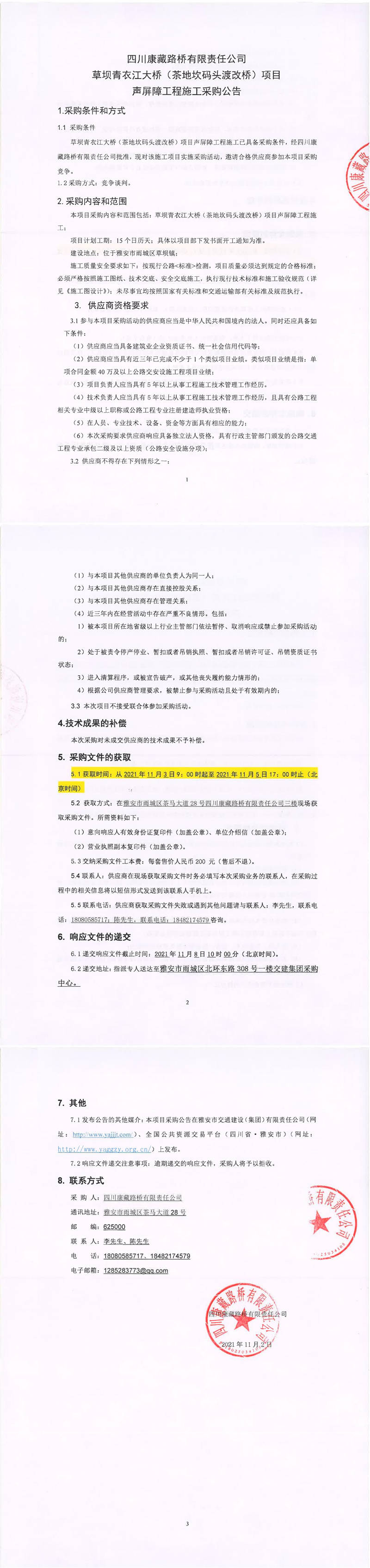 四川康藏路橋有限責任公司草壩青衣江大橋(茶地坎碼頭渡改橋)項目聲屏障工程施工競爭談判采購公告