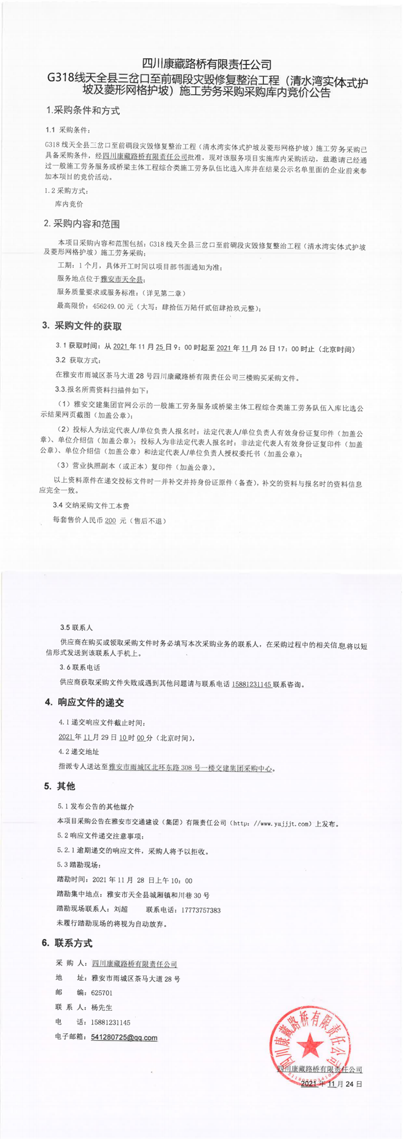 四川康藏路橋有限責(zé)任公司G318線天全縣三岔口至前碉段災(zāi)毀修復(fù)整治工程(清水灣實(shí)體式護(hù)坡及菱形網(wǎng)格護(hù)坡)施工勞務(wù)采購采購庫內(nèi)競價(jià)公告