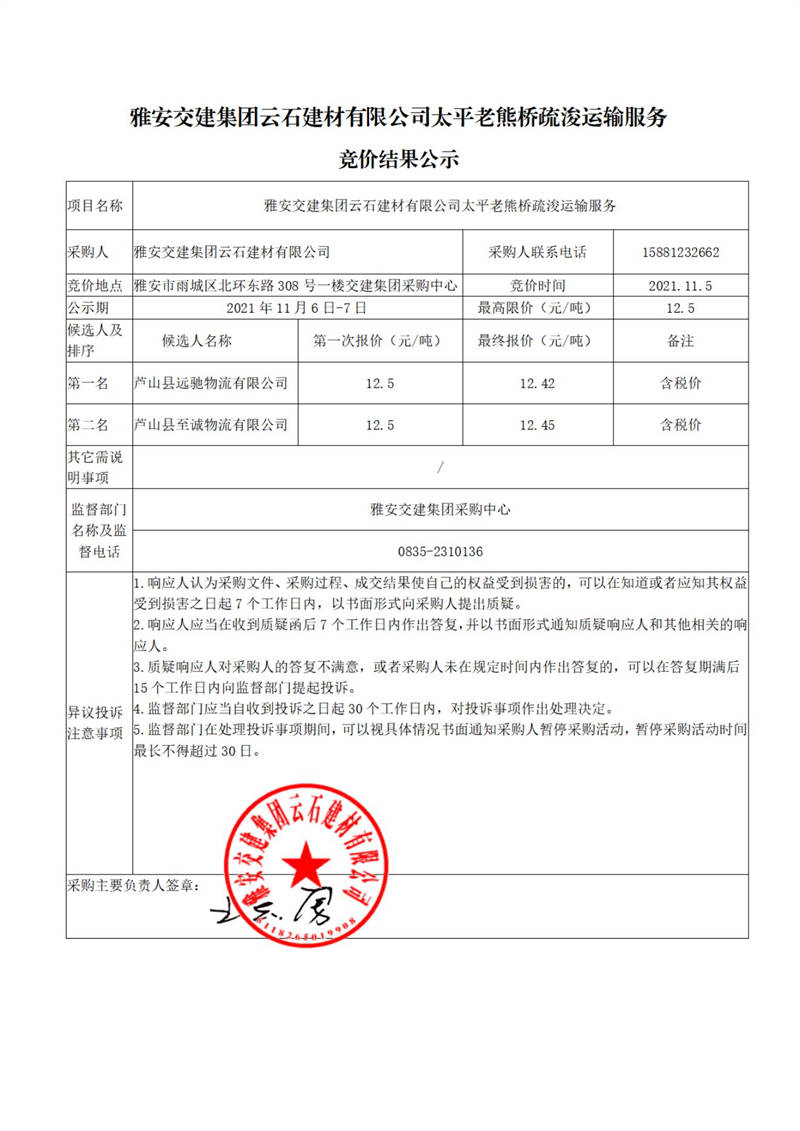 雅安交建集團(tuán)云石建材有限公司太平老熊橋疏浚運輸服務(wù)競價結(jié)果公示
