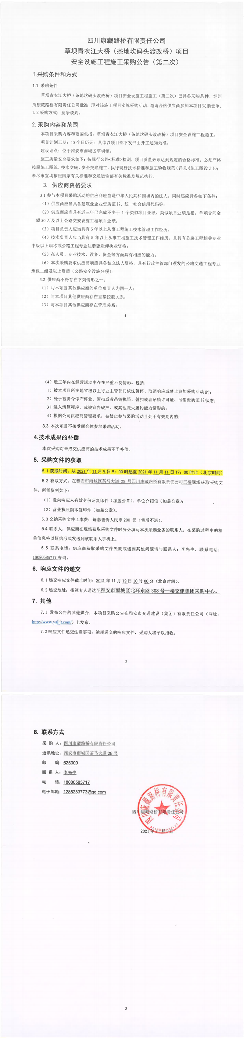 四川康藏路橋有限責任公司草壩青衣江大橋(茶地坎碼頭渡改橋)項目安全設(shè)施工程施工采購公告(第二次)