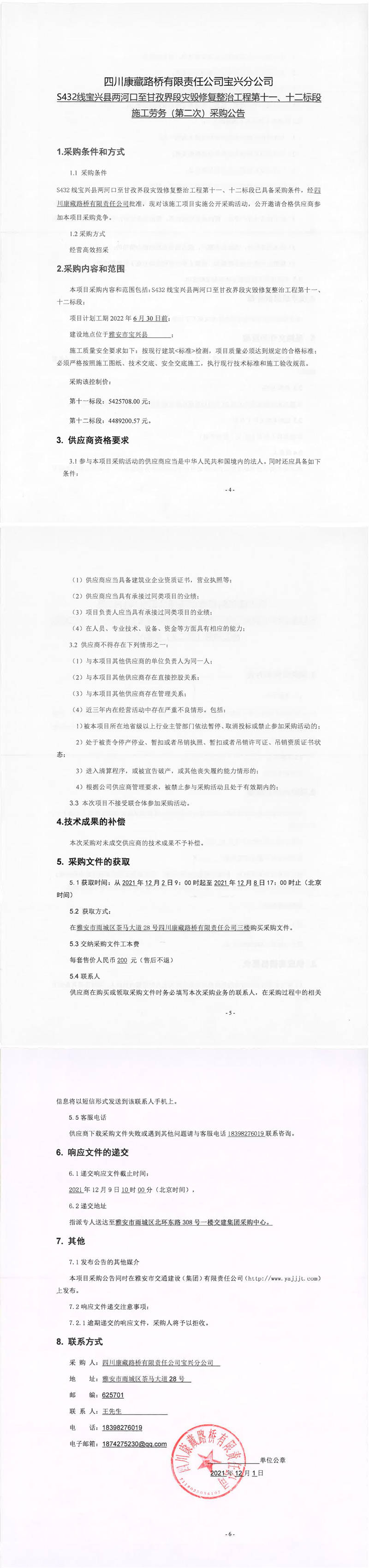 四川康藏路橋有限責(zé)任公司S432線寶興縣兩河口至甘孜界段災(zāi)毀修復(fù)整治工程第十一、十二標(biāo)段施工勞務(wù)(第二次)采購公告