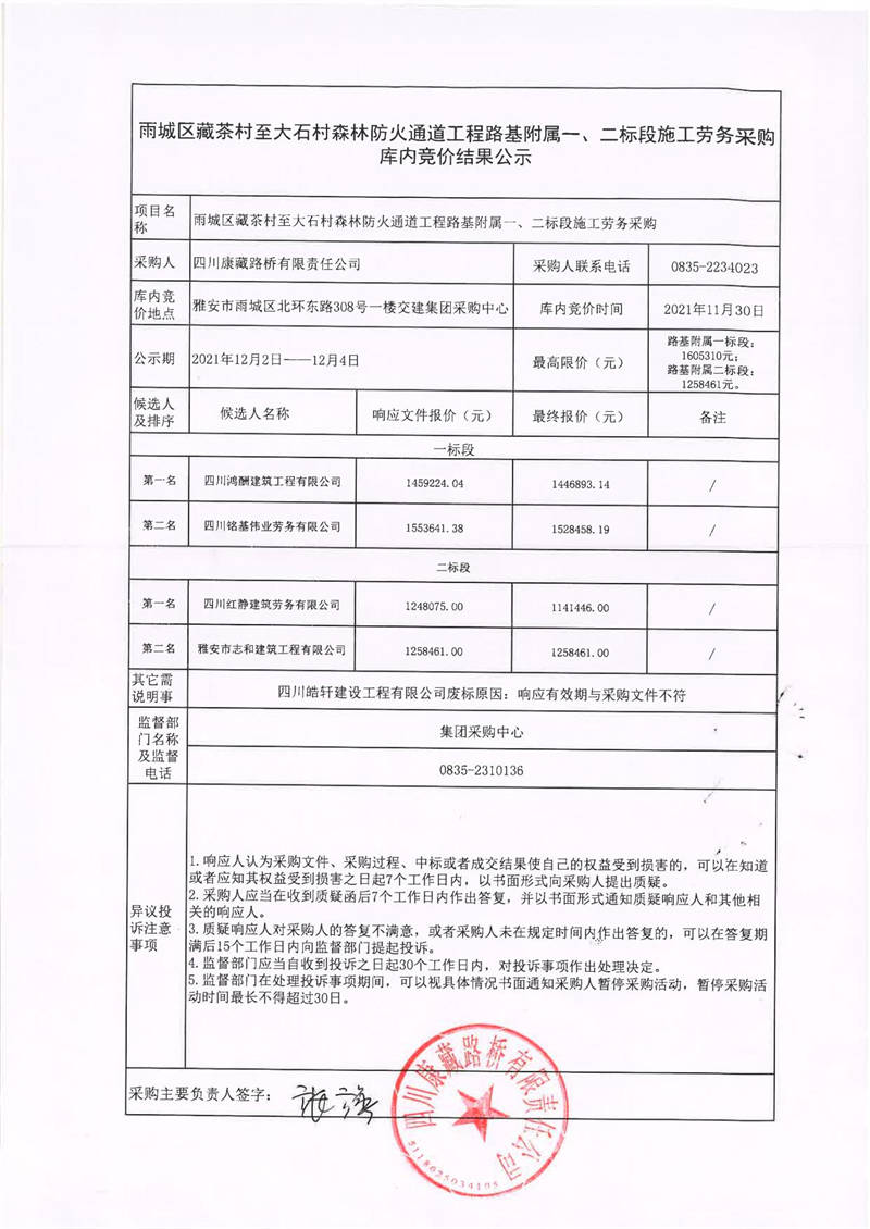 四川康藏路橋有限責(zé)任公司雨城區(qū)藏茶村至大石村森林防火通道工程路基附屬一、二標(biāo)段施工勞務(wù)采購(gòu)庫(kù)內(nèi)競(jìng)價(jià)結(jié)果公示