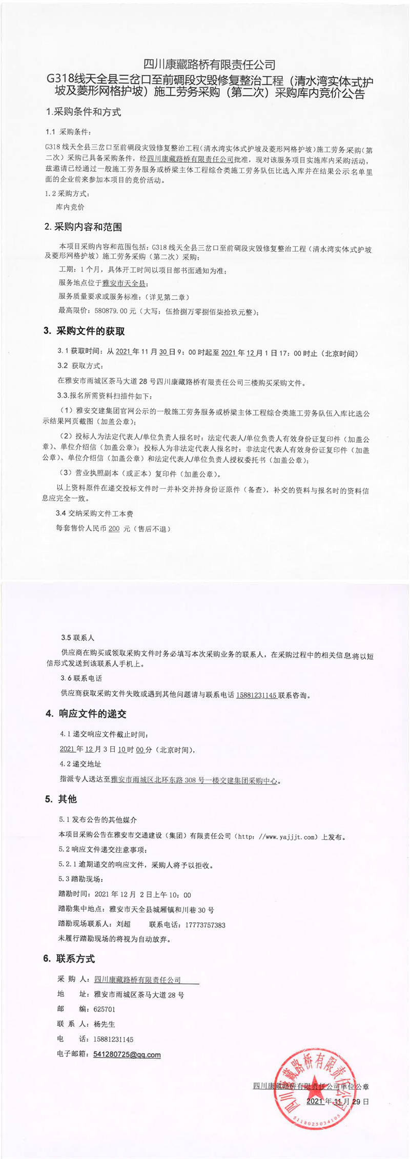 四川康藏路橋有限責任公司G318線天全縣三岔口至前碉段災毀修復整治工程(清水灣實體式護坡及菱形網(wǎng)格護坡)施工勞務采購(第二次)采購庫內(nèi)競價公告