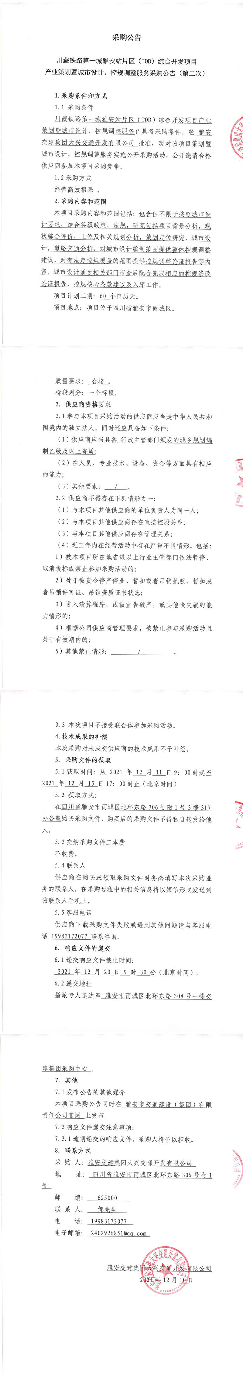 雅安交建集團大興交通開發(fā)有限公司川藏鐵路第一城雅安站片區(qū)(TOD)綜合開發(fā)項目產(chǎn)業(yè)策劃暨城市設計、控規(guī)調(diào)整服務采購公告(第二次)