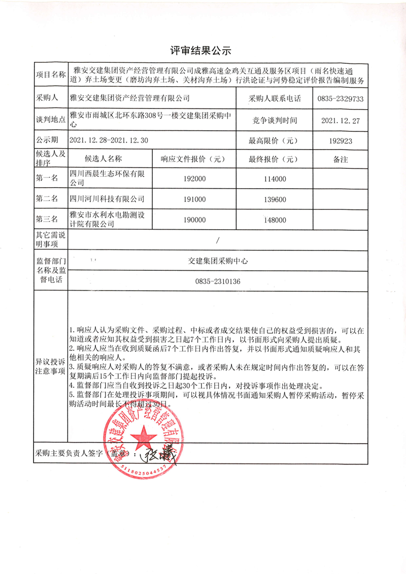 雅安交建集團(tuán)資產(chǎn)經(jīng)營管理有限公司成雅高速金雞關(guān)互通及服務(wù)區(qū)項(xiàng)目(雨名快速通道)棄土場變更(磨坊溝棄土場、關(guān)材溝棄土場)行洪論證與河勢穩(wěn)定評(píng)價(jià)報(bào)告編制服務(wù)評(píng)審結(jié)果公示