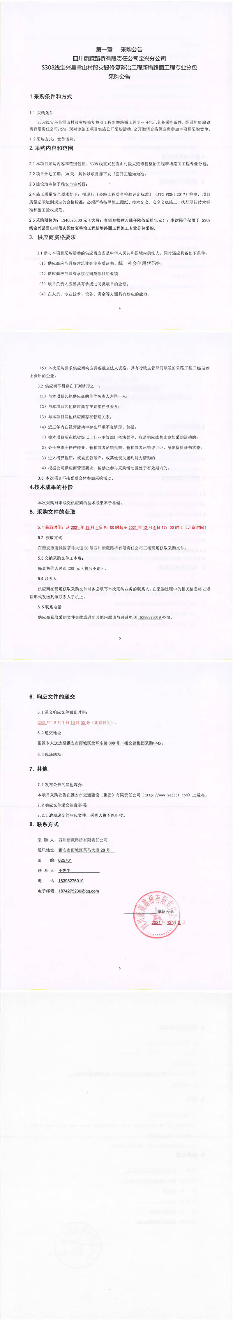 四川康藏路橋有限責(zé)任公司S308線(xiàn)寶興縣雪山村段災(zāi)毀修復(fù)整治工程新增路面工程施工專(zhuān)業(yè)分包采購(gòu)公告