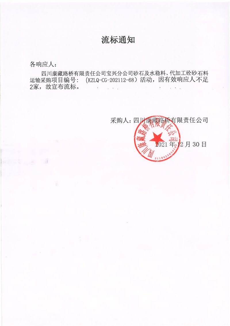 四川康藏路橋有限責(zé)任公司寶興分公司砂石及水穩(wěn)料、代加工砼砂石料運輸采購流標(biāo)通知