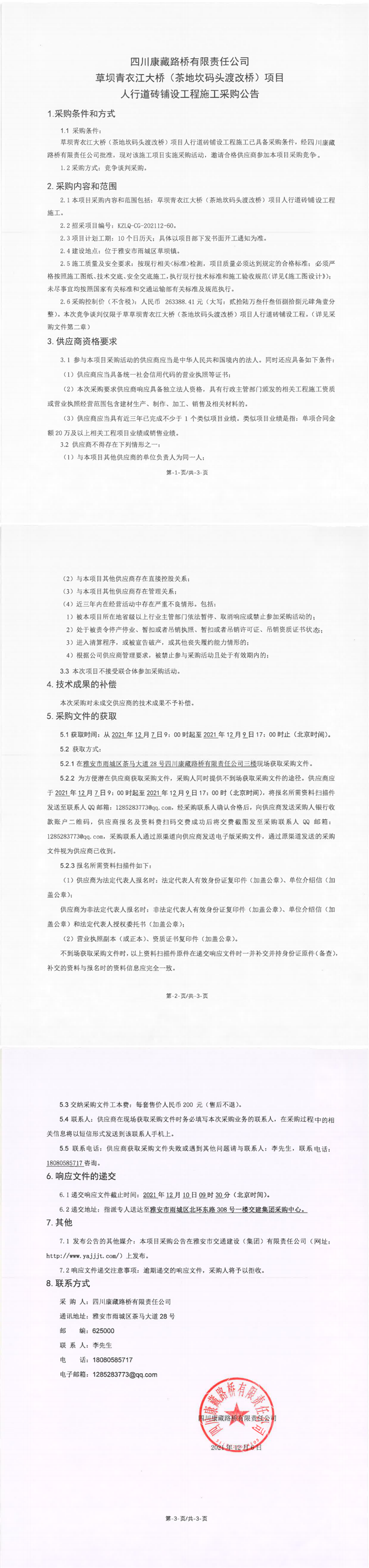四川康藏路橋有限責任公司草壩青衣江大橋(茶地坎碼頭渡改橋)項目人行道磚鋪設(shè)工程施工采購公告