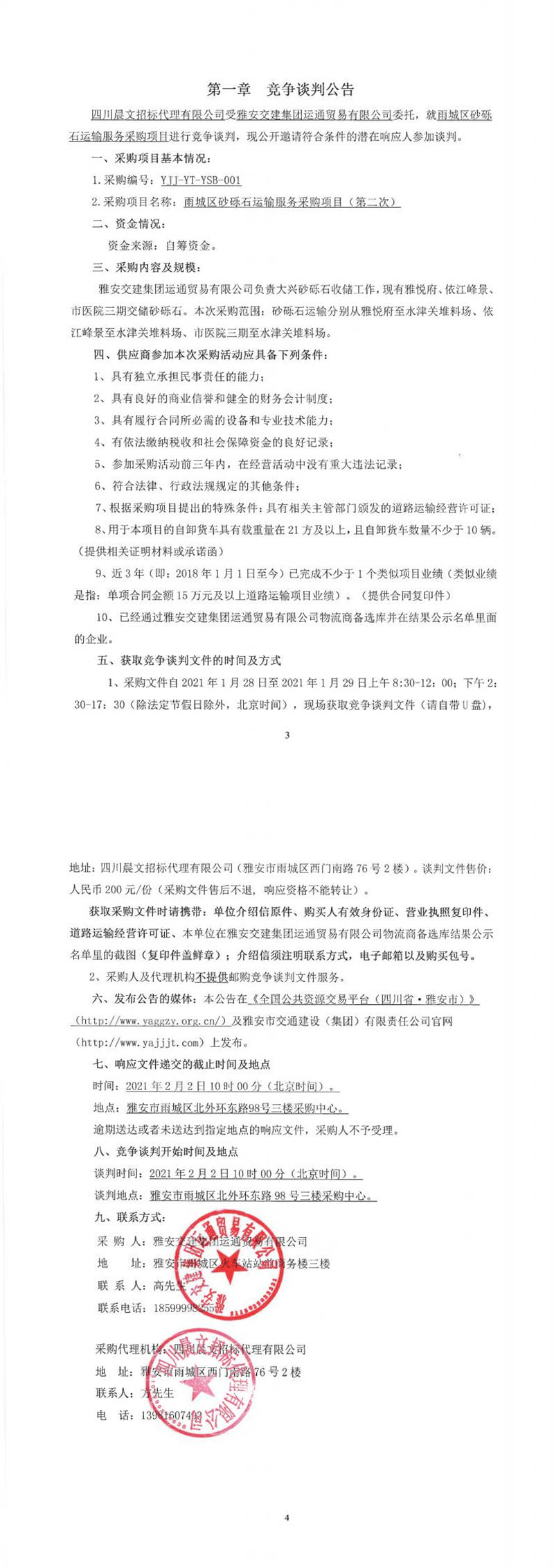 雅安交建集團(tuán)運(yùn)通貿(mào)易有限公司雨城區(qū)砂礫石運(yùn)輸服務(wù)采購(gòu)項(xiàng)目(第二次)競(jìng)爭(zhēng)談判公告