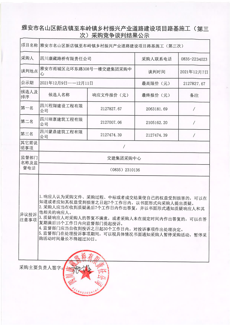四川康藏路橋有限責(zé)任公司雅安市名山區(qū)新店鎮(zhèn)至車嶺鎮(zhèn)鄉(xiāng)村振興產(chǎn)業(yè)道路建設(shè)項(xiàng)目路基施工(第三次)采購(gòu)競(jìng)爭(zhēng)談判結(jié)果公示