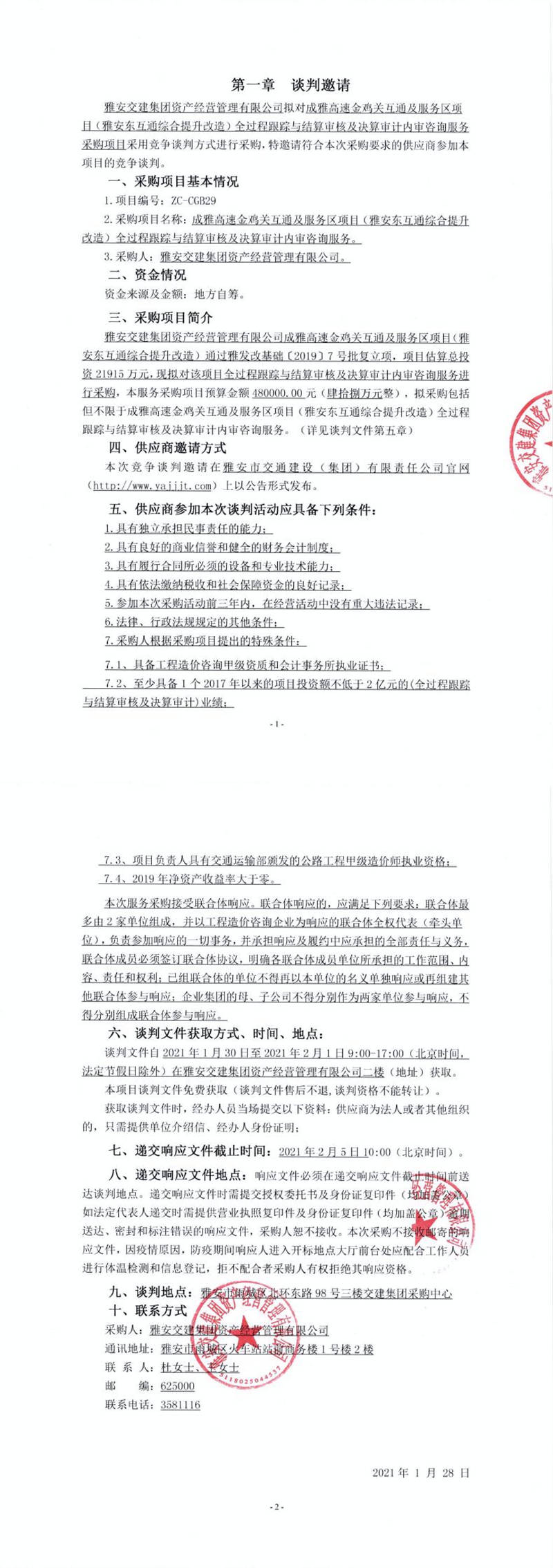 雅安交建集團(tuán)資產(chǎn)經(jīng)營管理有限公司成雅高速金雞關(guān)互通及服務(wù)區(qū)項(xiàng)目(雅安東互通綜合提升改造)全過程跟蹤與結(jié)算審核及決算審計內(nèi)審咨詢服務(wù)談判公告