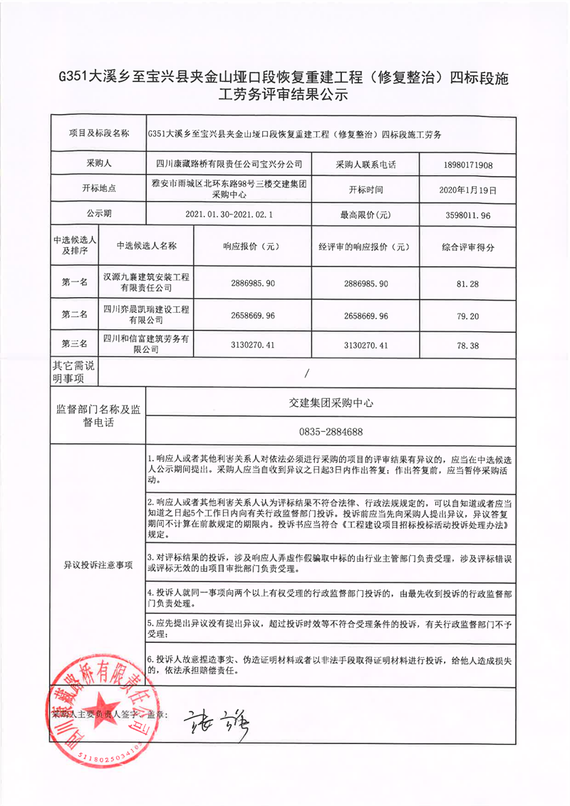 四川康藏路橋有限責任公司G351大溪鄉(xiāng)至寶興縣夾金山埡口段恢復重建工程(修復整治)四標段施工勞務(wù)評審結(jié)果公示