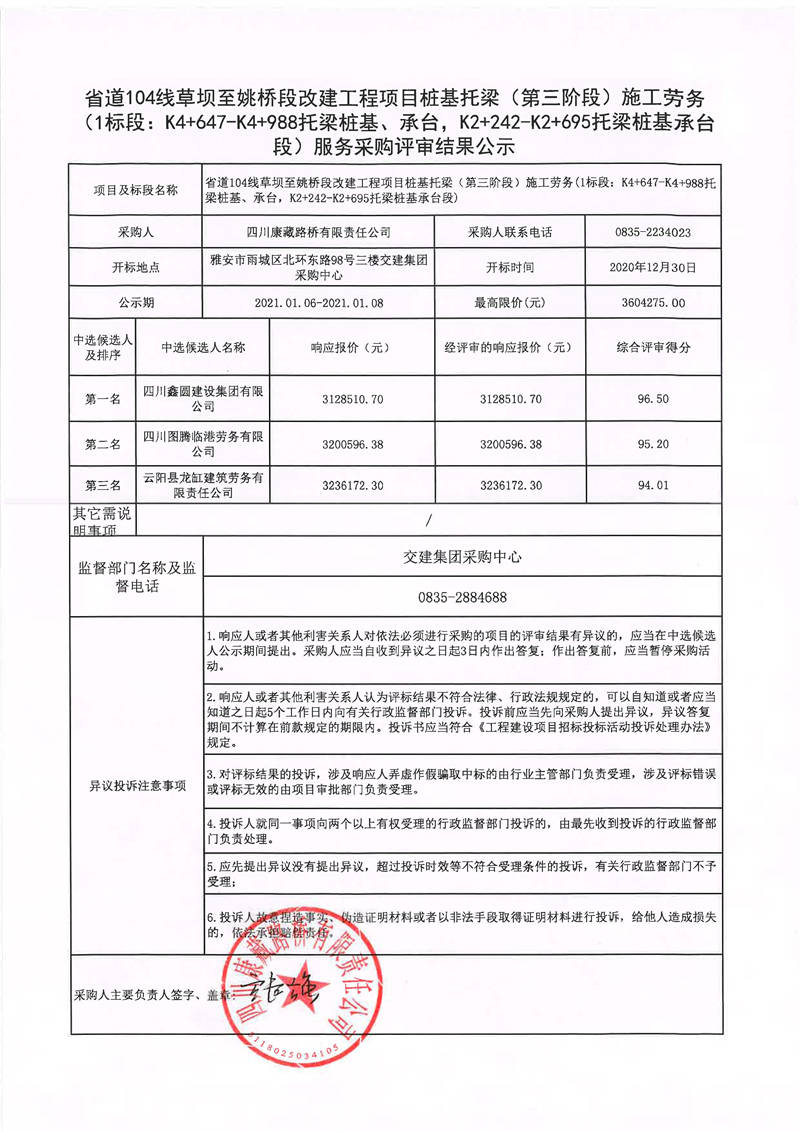 四川康藏路橋有限責(zé)任公司省道104線草壩至姚橋段改建工程項(xiàng)目樁基托梁(第三階段)施工勞務(wù)服務(wù)1標(biāo)段采購評審結(jié)果公示