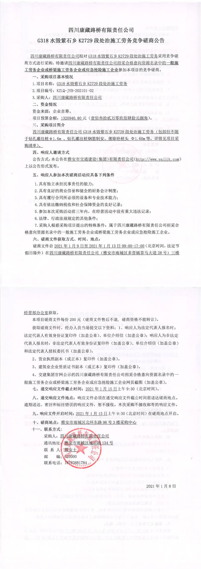 四川康藏路橋有限責任公司G318水毀紫石鄉(xiāng)K2729段處治施工勞務(wù)競爭磋商公告