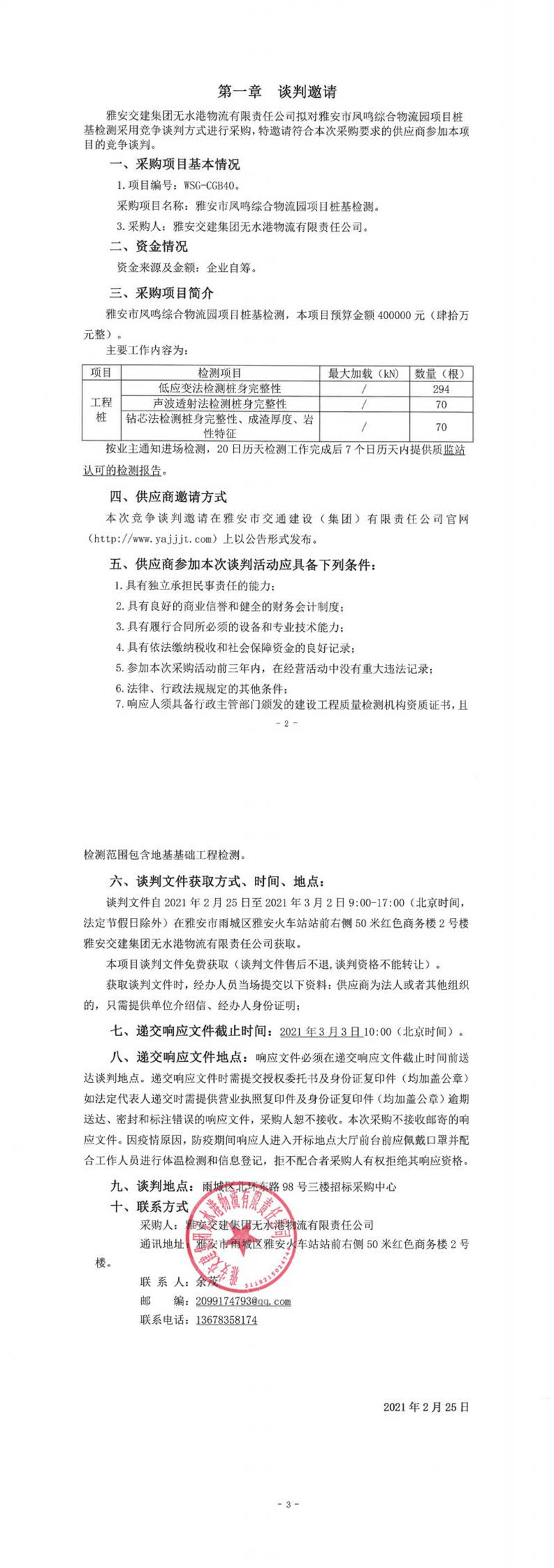 雅安交建集團無水港物流有限責(zé)任公司雅安市鳳鳴綜合物流園項目樁基檢測競爭談判公告