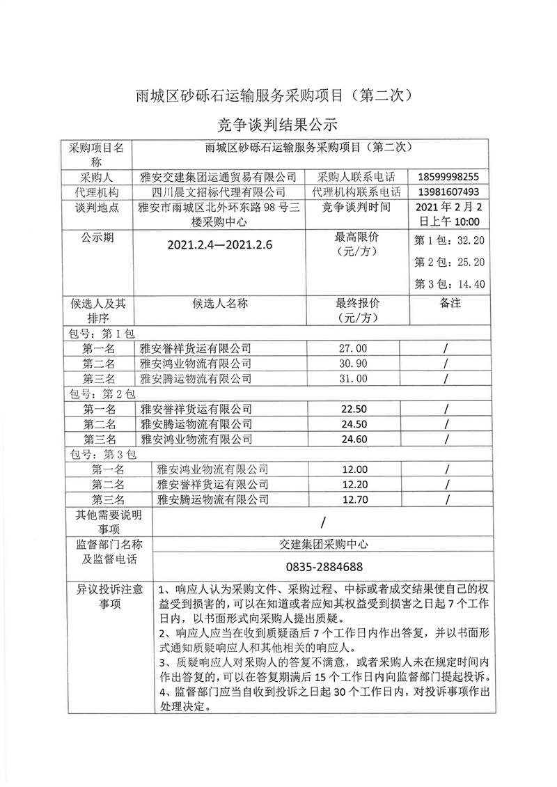 雅安交建集團運通貿(mào)易有限公司雨城區(qū)砂礫石運輸服務采購項目(第二次)競爭談判結(jié)果公示