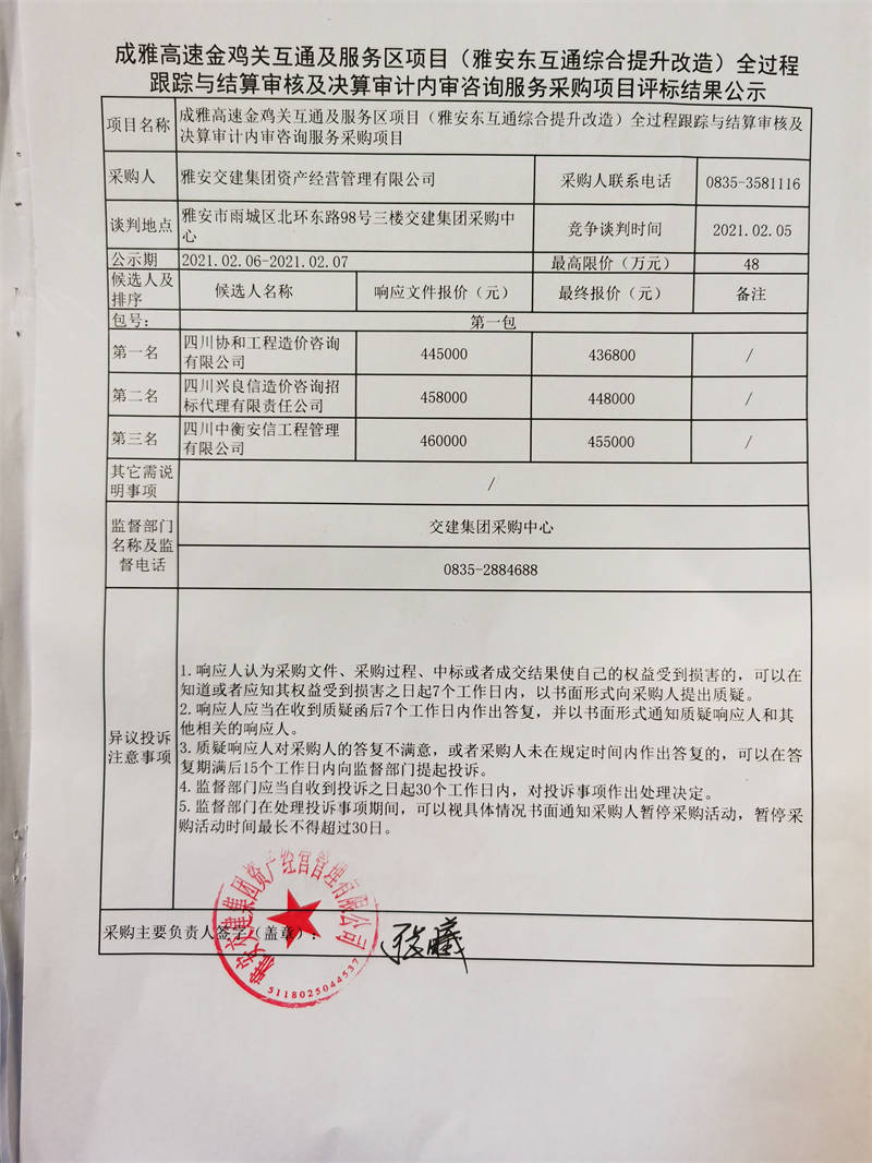 雅安交建集團(tuán)資產(chǎn)經(jīng)營管理有限公司成雅高速金雞關(guān)互通及服務(wù)區(qū)項(xiàng)目(雅安東互通綜合提升改造)全過程跟蹤與結(jié)算審核及決算審計(jì)內(nèi)審咨詢服務(wù)評(píng)標(biāo)結(jié)果公示