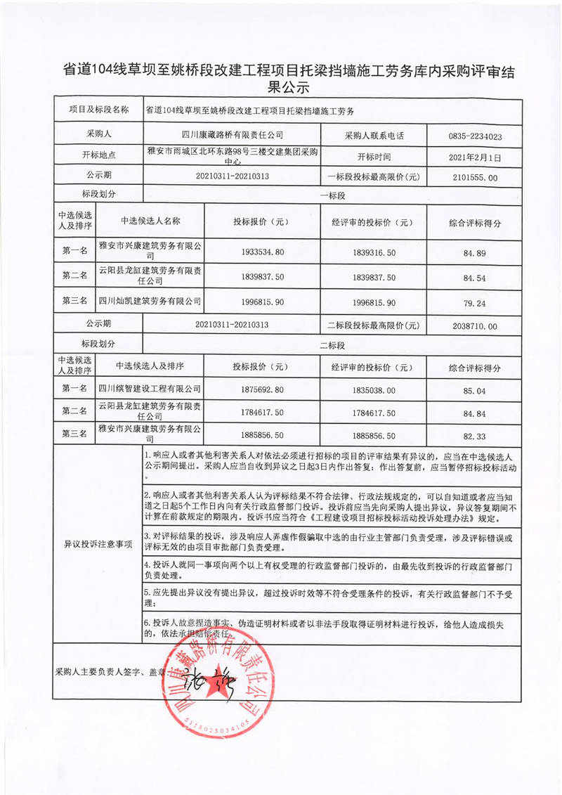 四川康藏路橋有限責(zé)任公司省道104線草壩至姚橋段改建工程項(xiàng)目托梁擋墻施工勞務(wù)庫內(nèi)采購評(píng)審結(jié)果公示