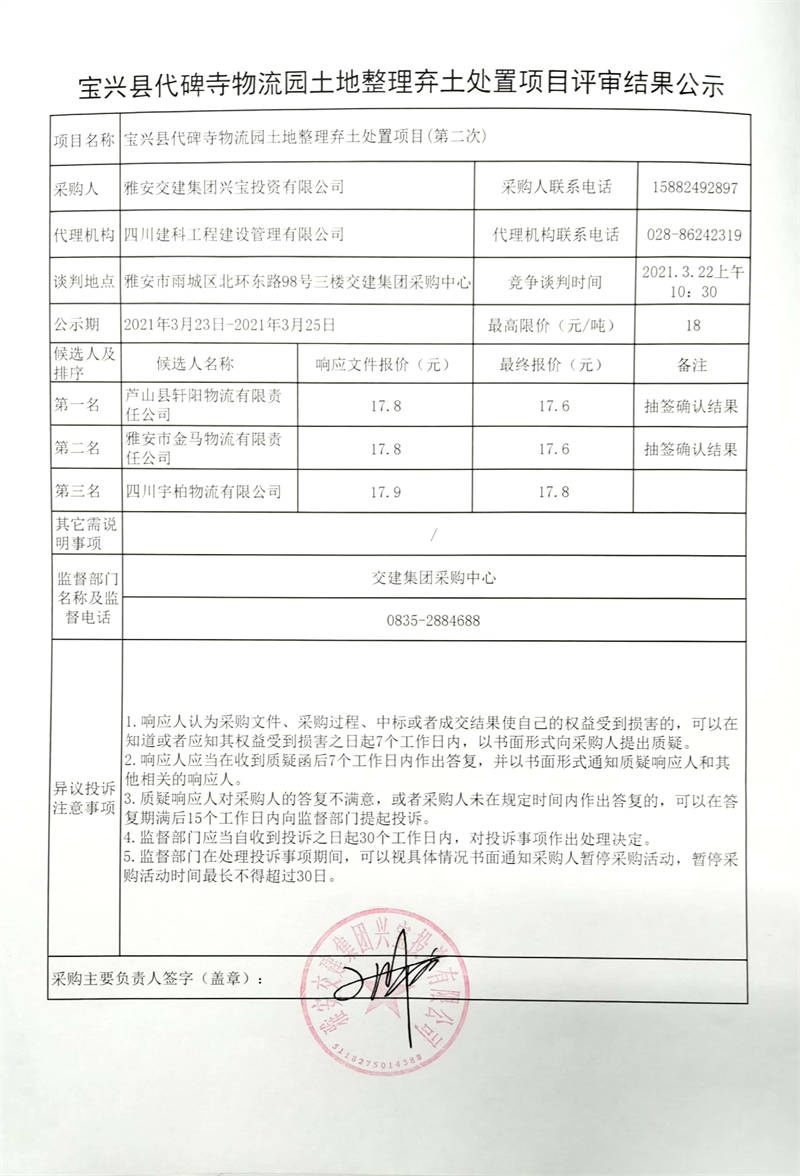 雅安交建集團(tuán)興寶投資有限公司寶興縣代碑寺物流園土地整理棄土處置項目評審結(jié)果公示